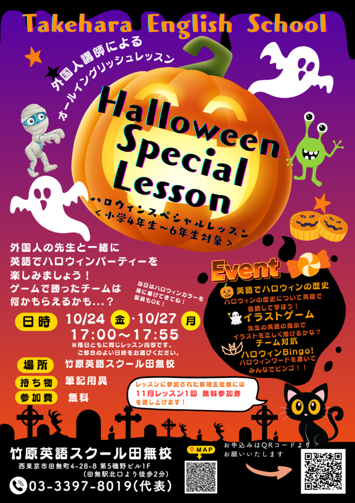 皆様、こんにちは! 竹原英語スクール田無校の夏です。 10月といえば…ハロウィン✨です! 「お菓子くれないといたずらしちゃうぞ…!(Trick or Treat!)」と 何気なく言いたくなる、この季節がやってきました🎃 田無校では、小学4~6年生の方を対象としたハロウィンスペシャルレッスンを開催します! 外国人講師によるオールイングリッシュレッスンで、楽しみながら英語を学びます。 ハロウィンにちなんだ単語を使ってみんなでビンゴをしたり、ハロウィンの歴史について学んだり、、さらには先生の指示でイラストを正しく描けるか、というイラストゲームも実施します! ゲームで勝ったチームには、何かもらえるかも…? 当日はハロウィンカラーを身に着けて来てください! ハロウィンの仮装も大歓迎です! レッスンに参加された新規生徒様には、なんと 『11月レッスン1回 無料券』を差し上げます! 皆さん、ぜひお友達を誘ってハロウィンパーティーを楽しみましょう! 【日時】 10/24(金)・10/27(月) 17:00-17:55 ※両日ともに同じレッスン内容となります。 ご都合のよい日程をお選びください。 お待ちしております! お申し込みはこちら↓ https://forms.gle/ZW8SNUjpAJo4UWuD6